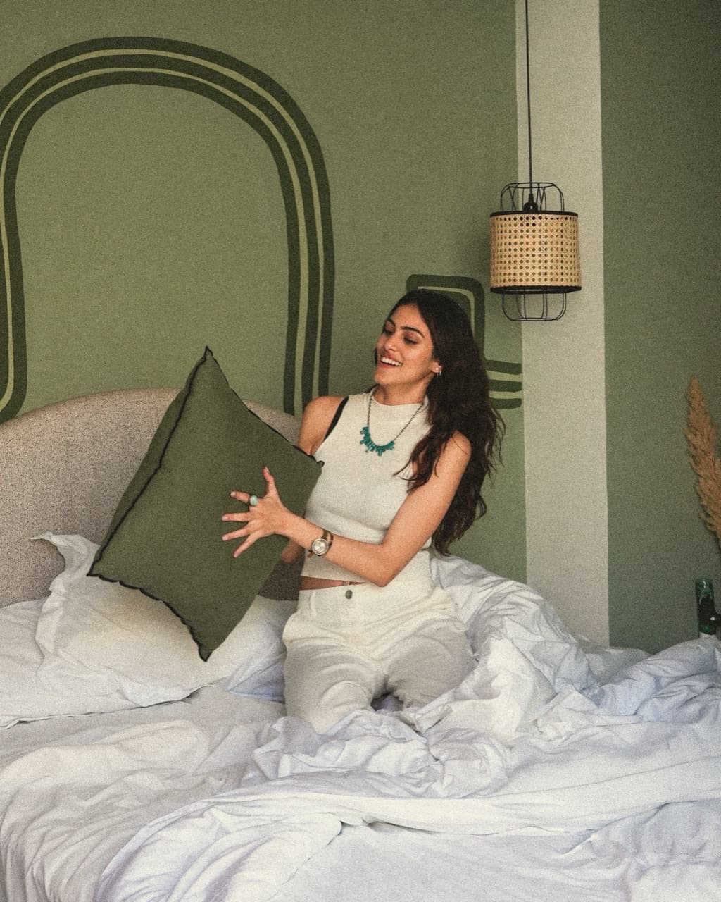 Traveler smiling while reading a magazine in bed